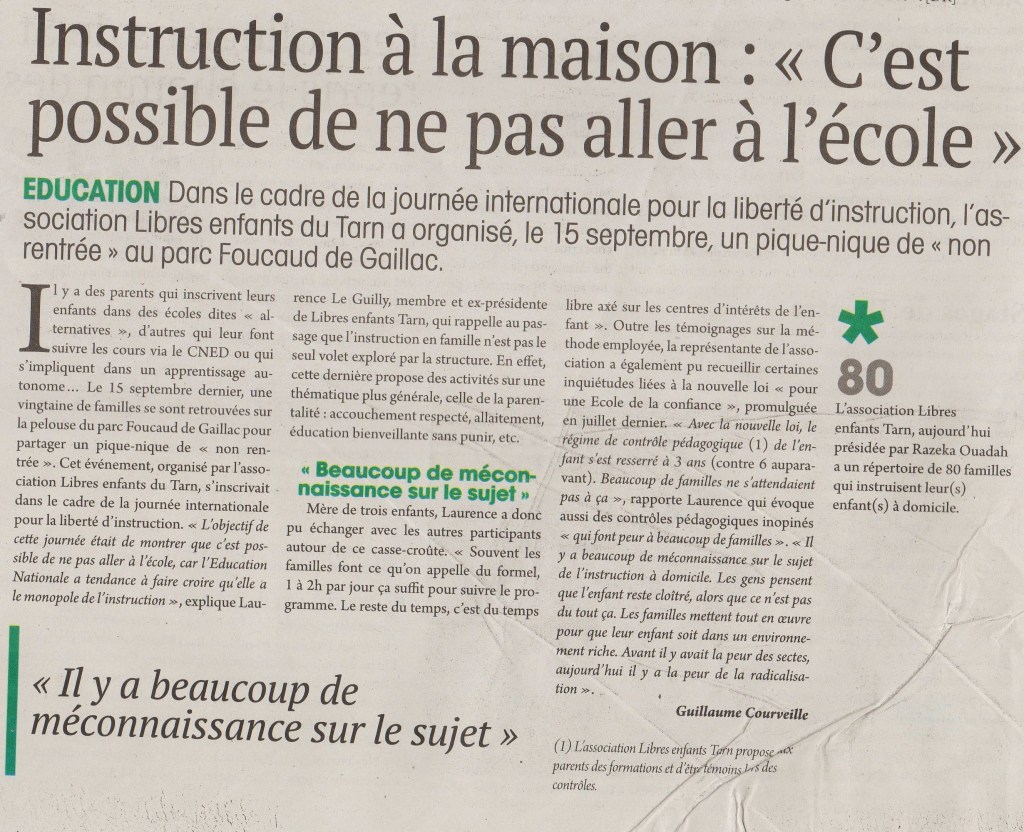 Article sur l’asso dans le Tarn Libre (27.09.2019) 28 septembre 20196 avril 2020 / Libres Enfants du Tarn Partager :TweetJ’aime chargement… Articles similaires
