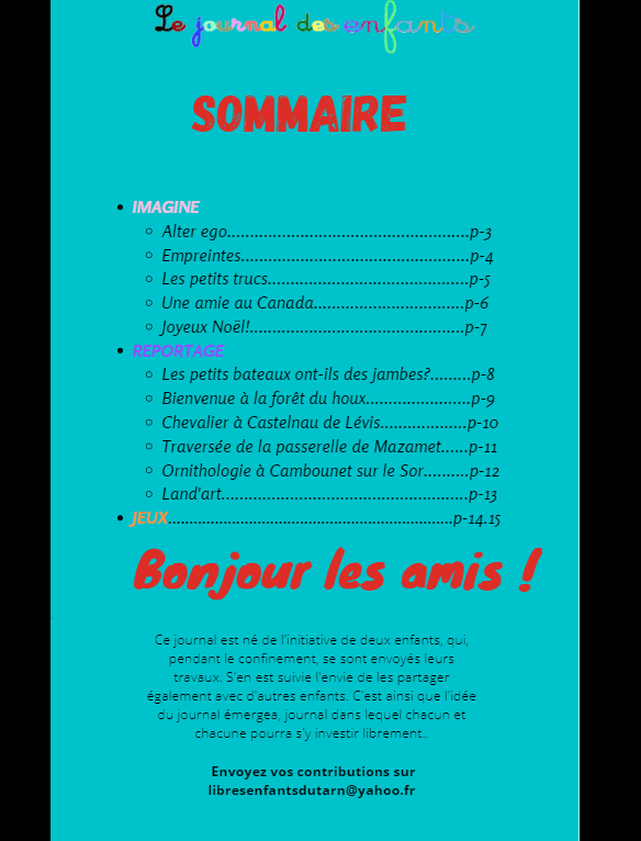 Le numéro 3 du Journal des Enfants sera sur le thème du PRINTEMPS. Vous pouvez envoyer vos contributions (dessins, articles, jeux…) dès maintenant et jusqu’au 16 mai sur libresenfantsdutarn@yahoo.fr