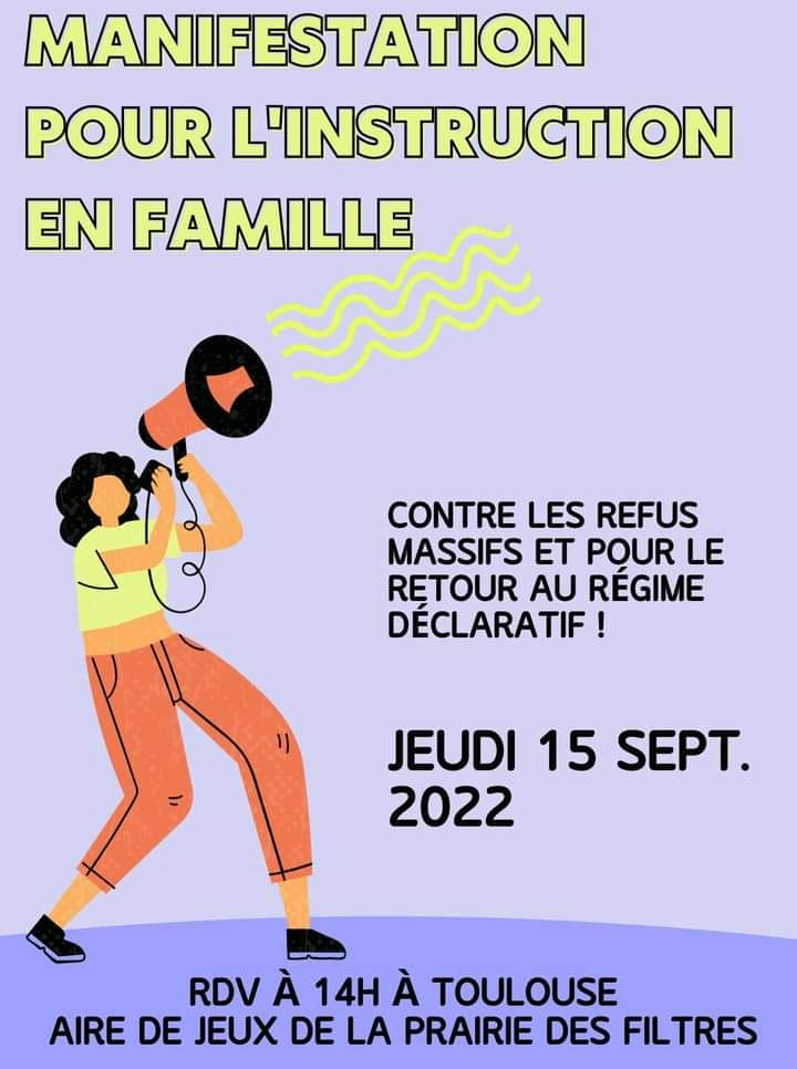 Nous appelons également toutes les familles concernées (c’est-à-dire les familles refusées, les acceptées, les plein-droit mais aussi les familles qui scolarisent tout en sachant bien que l’IEF peut être nécessaire à tout moment et que c’est une option qui doit être préservée) à rejoindre l’appel à manifester à Toulouse le jeudi 15 septembre 2022, à l’occasion de la Journée Internationale pour la Liberté d’Instruction, à partir de 14h à la Prairie des Filtres (pique-nique dès midi à l’aire de jeux)