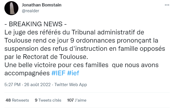 Cette situation cauchemardesque pour les familles vire à l’absurde quand on voit qu’hier encore 9 familles ont eu gain de cause devant le tribunal administratif de Toulouse, le juge des référés ayant enjoint le recteur de délivrer une autorisation d’IEF provisoire pour la rentrée dans l’attente d’un jugement sur le fond (tout en condamnant en plus l’Education nationale à rembourser les frais de justice.)