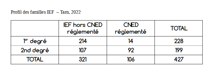 – 321 enfants en IEF hors CNED réglementé, dont 214 enfants du 1er degré (maternelle + primaire) et 107 enfants du 2nd degré (collège)