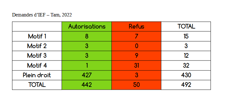La seule autorisation accordée l’aurait été après un recours et avec des éléments de santé complémentaires (donc un pseudo motif 1), mais cela ne correspond pas aux informations dont on dispose. Le chiffre de 2 familles du département au TA n’est pas en accord avec nos données de terrain non plus (nous dénombrons au moins 5 familles dont une ayant saisi le Conseil d’État).