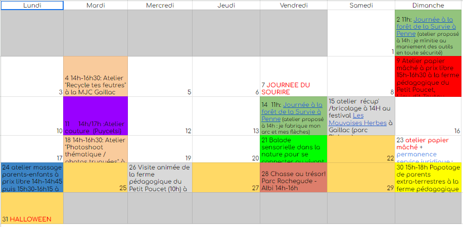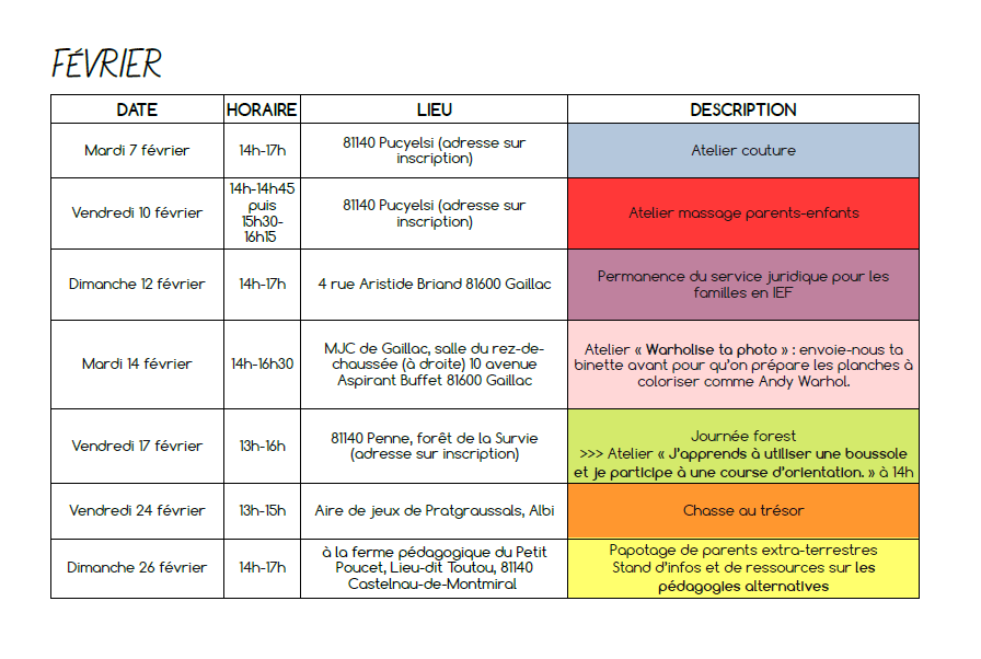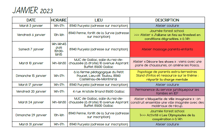 - deux journées en forêt par mois à Penne : nous continuons à utiliser notre parcelle de forêt, à la décorer, à l’observer changer au fil des saisons et à nous y sentir bien. La « Forêt de la Survie », comme elle a été baptisée par les enfants, accueillera, cette année encore, des rencontres parents-enfants où chacun est libre de ses mouvements et de ses activités. Une proposition d’atelier ou d’activité sera faite chaque fois à 14h. On peut arriver et repartir quand on veut ! Les journées ont lieu qu’il vente, qu’il pleuve, qu’il neige un vendredi et un dimanche par mois pour permettre aux scos comme aux non-scos de participer.
