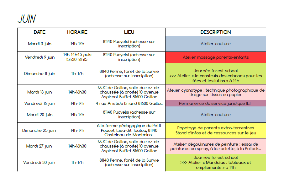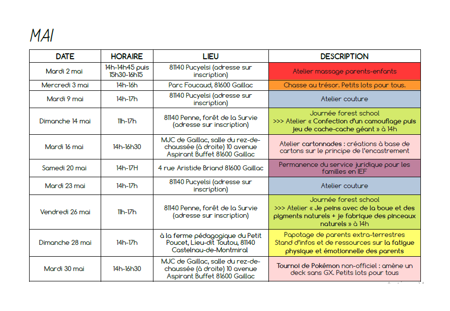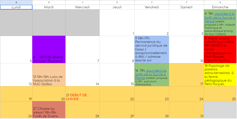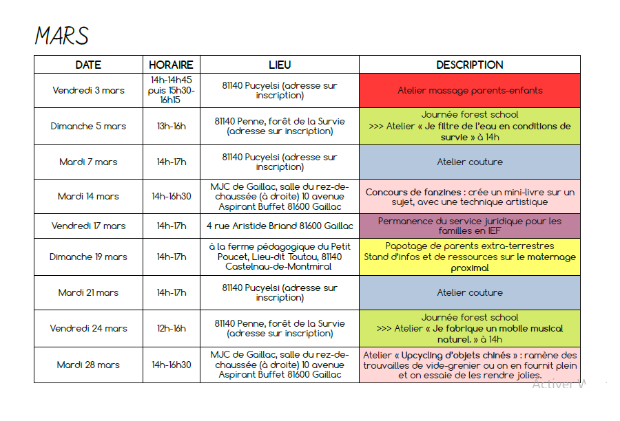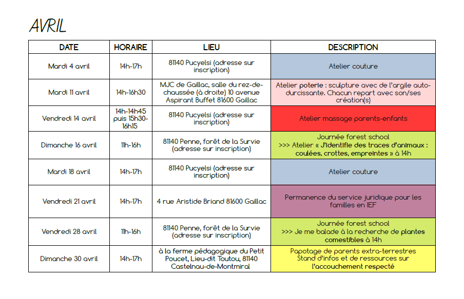 - deux journées en forêt par mois à Penne : nous continuons à utiliser notre parcelle de forêt, à la décorer, à l’observer changer au fil des saisons et à nous y sentir bien. La « Forêt de la Survie », comme elle a été baptisée par les enfants, accueillera, cette année encore, des rencontres parents-enfants où chacun est libre de ses mouvements et de ses activités. Une proposition d’atelier ou d’activité sera faite chaque fois à 14h. On peut arriver et repartir quand on veut ! Les journées ont lieu qu’il vente, qu’il pleuve, qu’il neige un vendredi et un dimanche par mois pour permettre aux scos comme aux non-scos de participer.