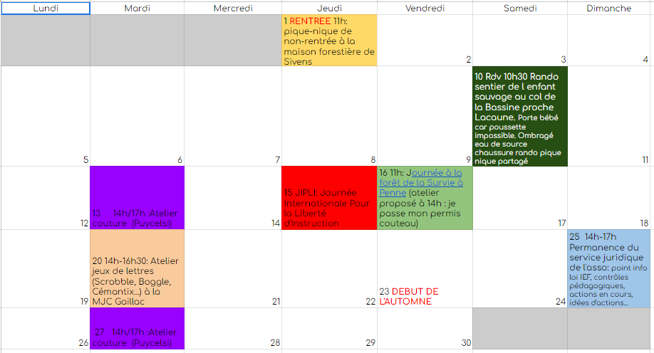 - une permanence mensuelle du service juridique de l’asso : car la législation autour de l’instruction en famille évolue, car les familles sont en lutte contre des abus et des discriminations dans l’application de l’art. 49 de la loi dite « séparatisme », vous pouvez venir poser des questions, partager vos doutes, échanger sur les contrôles pédagogiques, vous informer sur la nouvelle loi, travailler à nos côtés sur l’un des chantiers en cours ou tout simplement écouter les débats de l’équipe autour d’une tasse de thé !