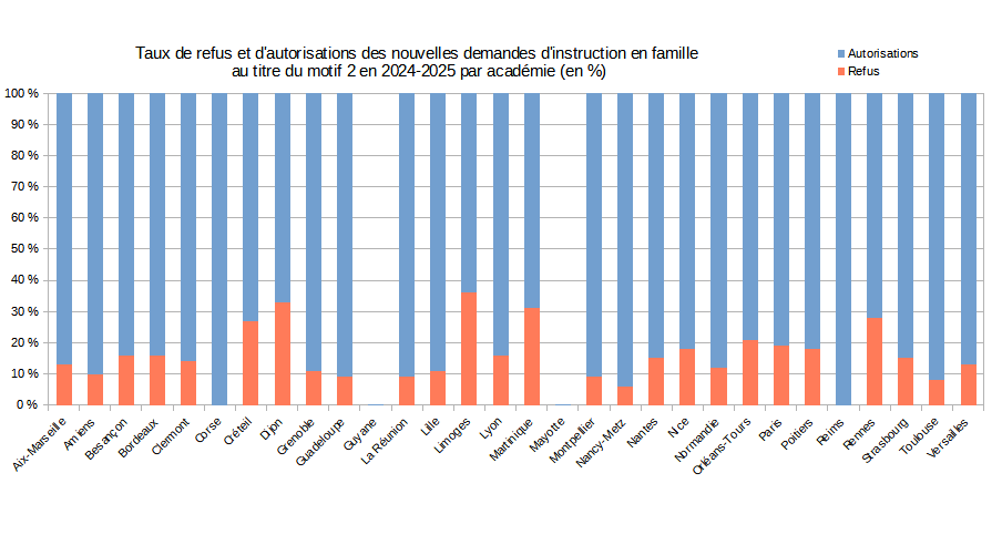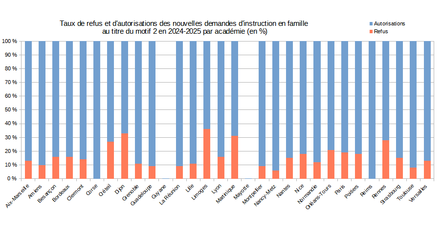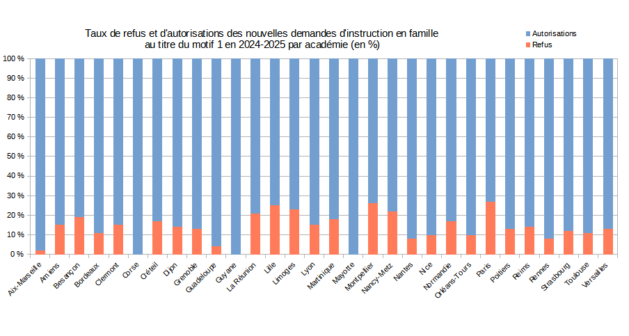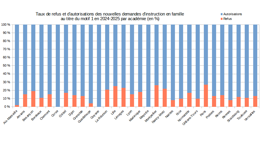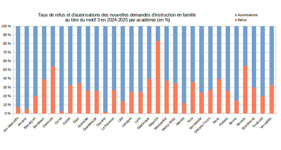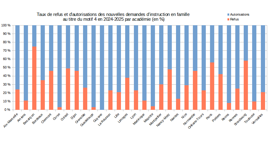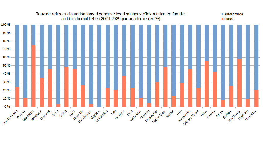 On réalise aussi que les disparités d’une académie sur l’autre sont toujours très fortes, malgré les promesses du ministère de travailler à une harmonisation des pratiques. Si l’extrême désorganisation des rectorats mise en avant dans notre enquête de 2023 intitulée « La cacophonie des DSDEN de France » pouvait s’expliquer par la débandade logistique suite à la nouvelle loi, il n’y a aujourd’hui plus aucune excuse : les pratiques devraient être les mêmes partout, l’interprétation du motif 4 devrait être la même qu’on habite à Nantes ou à Strasbourg, à Paris ou dans les DROM-COM. Or, ce n’est pas du tout le cas : les taux de refus varient de 0% à … 75% !