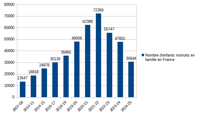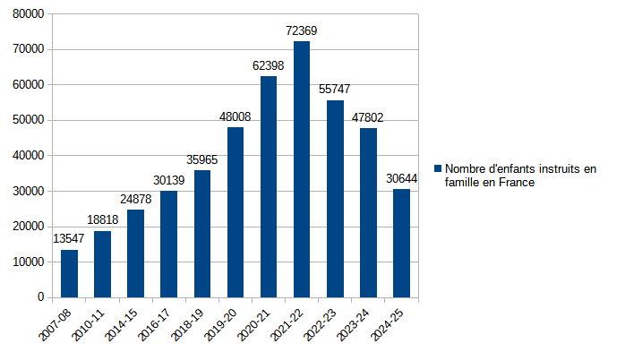 Sur ce graphique, on observe un pic entre les années 2019 et 2022, dû en partie à un gonflement des chiffres qui ont assimilé les enfants de 3 à 6 ans (avant, l’instruction était obligatoire à partir de 6 ans seulement, les chiffres de l’IEF ne comptaient donc pas les enfants de moins de 6 ans). Ce pic est également dû à la période « Covid » avec de nombreuses familles qui ont découvert l’école à la maison pendant le confinement et ont souhaité poursuivre, suivies par des parents anti-vax et anti-masques.
